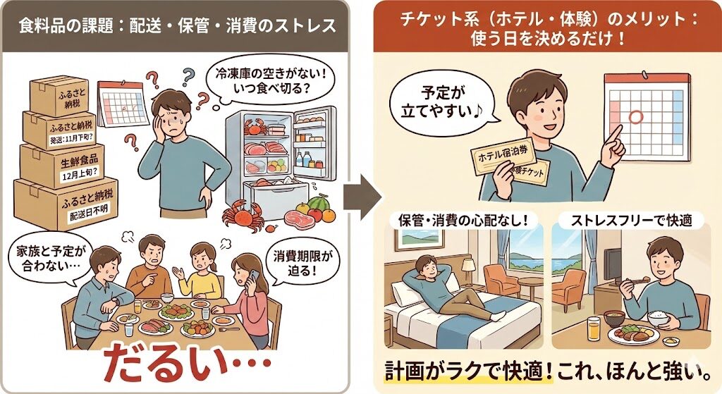 個人的には、食料品はうれしい反面、受け取り・保管・消費のスケジュール調整がしんどくて、だんだんチケット系に寄っていきました。