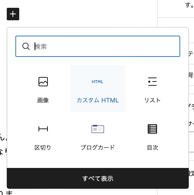 投稿を載せたい場所に「カスタムHTML」ブロックを追加し、先ほどコピーしたThreadsの埋め込みコードを貼り付けます。