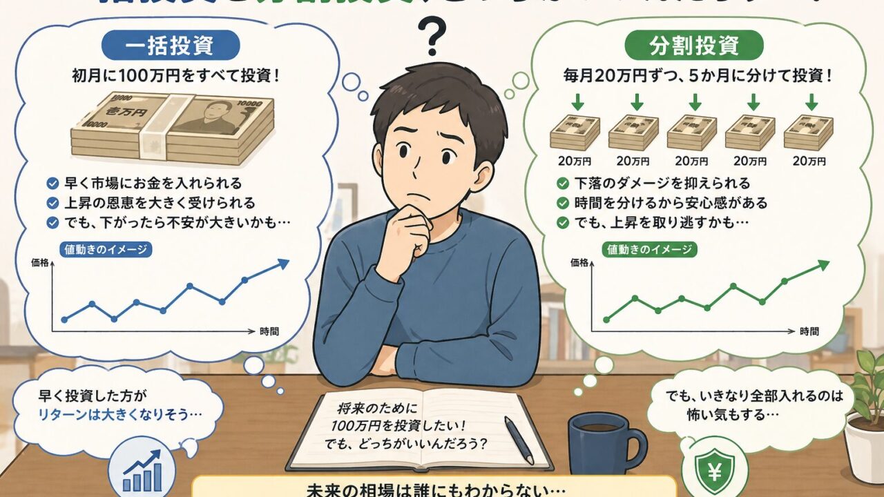投資を始めるときに悩みやすいのが、まとまったお金を「一括で投資するか」「分割して投資するか」という問題。